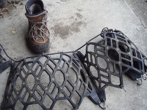 雪の無い凍結道路や濡れた石畳は、アイゼン(4本爪や6本爪)では、歩き難い。と言って転んでも痛いし・・ モンベルの靴は良く滑るので、アイゼンは必携だし・・ タイヤサイズが合わず、経過年数も過ぎたタイヤチェーンをアイゼンに改造できないかと前々か…