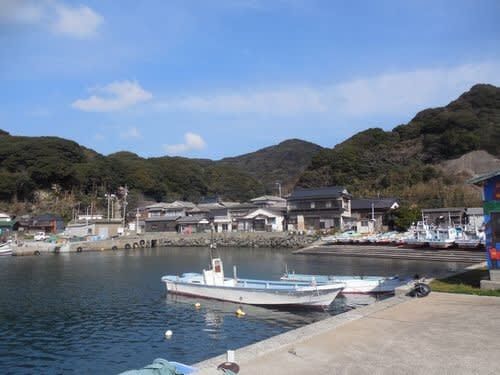 宗像大島の御嶽山へ行くつもりで神湊漁港へ着いたが、船の時間を間違っていたため出航したばかりだったので、間も無く出航する地の島行きで遠見山・祇園山へ行くことに変更した 泊漁港に到着、左手に厳島神社の鳥居・階段が見えている 厳島神社の横を通過 つ…
