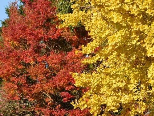 昨日写したモミジ・・・、午前中だったので陽の当たりが悪くパッとしなかった。 午後の散歩で見た時は、陽が当たり色が良く出ていたので、きょうは午後からの撮影。 銀杏の黄葉とモミジの紅葉。 銀杏と紅葉。 昨日と同じ場所なのに見栄えが違います。