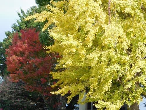 散歩道脇のモミジが良い色合いになったなぁ・・と思っていたら、雨で散ってしまった。 銀杏の葉も散って見応えが無くなってきた。 残ったモミジの写真を撮ってみたが、陽が当たらず、色が出ていない。 ぐるっと散歩して銀杏の脇にモミジを見つけた。 銀杏と…