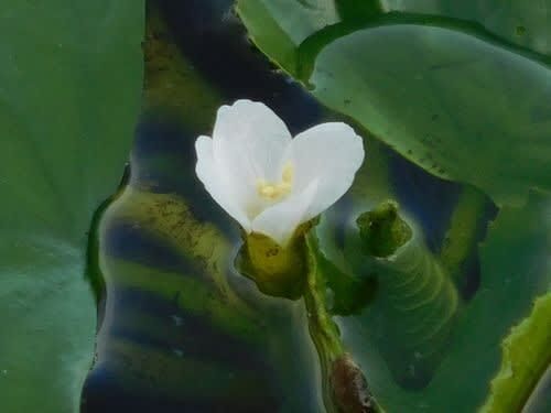 提の水面をヒシが覆っていた、そして点々と白い花が見えた。 ヒシ。 ヤブミョウガ。 ボタンヅル。