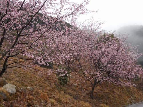 満開の河津桜。傘をさして下って来る登山者を3人見た。やはり雨の日は少ないようです。